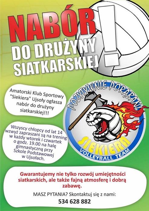 Amatorski Klub Sportowy "Siekiera" z Ujsół ogłosił właśnie nabór do drużyny siatkarskiej zajęcia dla chłopaków od 14 lat. Treningi odbywać się będą w każdy wtorek i czwartek o godz. 19.00 na Hali Gimnastycznej przy SP w Ujsołach. Kontakt poniżej.