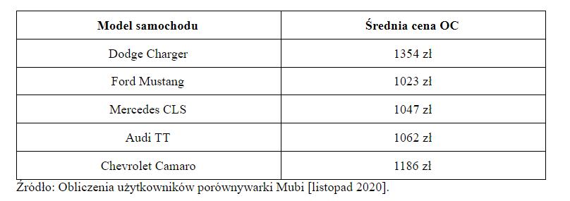 Dla porównania spójrzmy na średnie ceny OC modeli miejskich. Okazuje się, że ubezpieczenie niektórych z nich może być nawet dwukrotnie tańsze niż ochrona sportowego auta.
