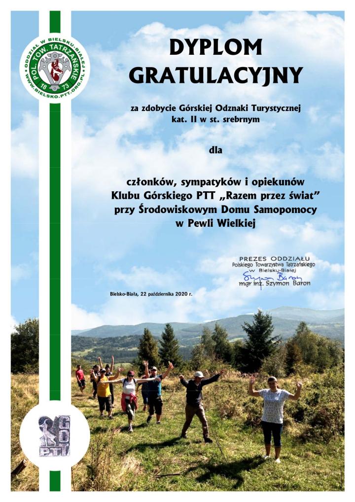 Z wielką radością informujemy, że uczestnicy Środowiskowego Domu Samopomocy w Pewli Wielkiej weszli w 2020 roku na 15 szczytów (wzniesień) górskich, aby zdobyć Górską Odznakę Turystyczną Polskiego Towarzystwa Tatrzańskiego kategorii II w stopniu srebrnym. Dokonali tego w trzy miesiące (od 10 sierpnia do 9 października 2020 roku) wędrując po Beskidzie Żywieckim, Beskidzie Śląskim, Beskidzie Makowskim, Beskidach Orawskich i Pogórzu Gubałowskim.