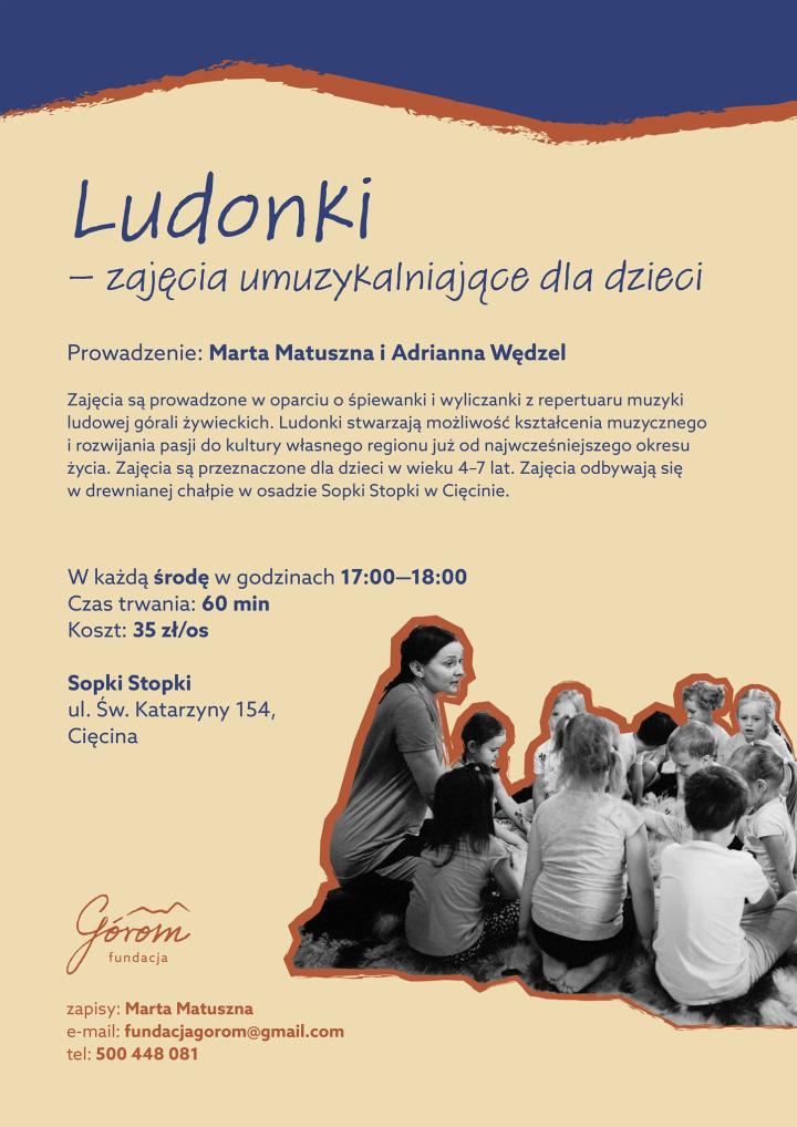 Zajęcia są prowadzone w oparciu o śpiewanki i wyliczanki z repertuaru muzyki ludowej górali żywieckich. Ludonki stwarzają możliwość kształcenia muzycznego i rozwijania pasji do kultury własnego regionu już od najwcześniejszego okresu życia. Zajęcia są przeznaczone dla dzieci w wieku 4-7 lat. Zajęcia będą odbywać się w drewnianej chałupie w osadzie Sopki Stopki w Cięcinie.