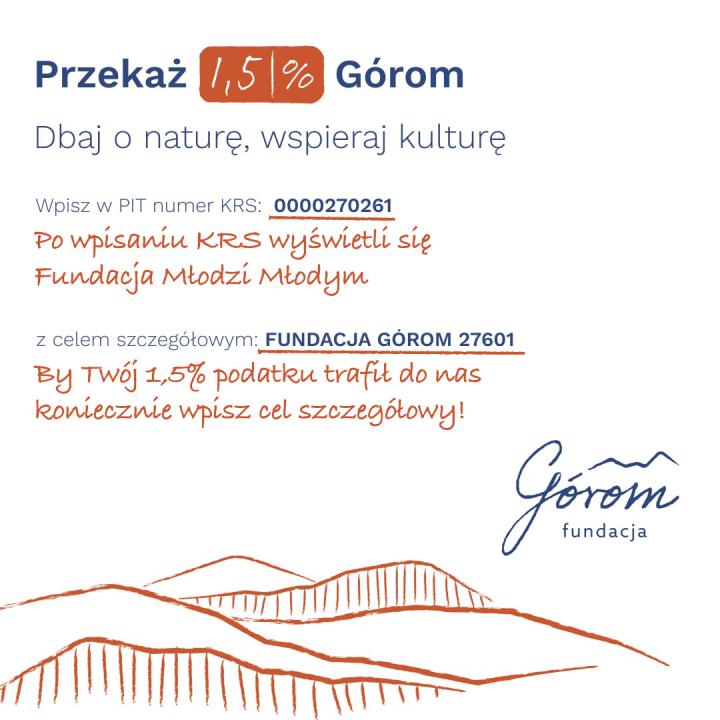 Aby Twoje 1,5% podatku trafiło do nas, pamiętaj, by wpisać cel szczegółowy: Fundacja Górom 27601.