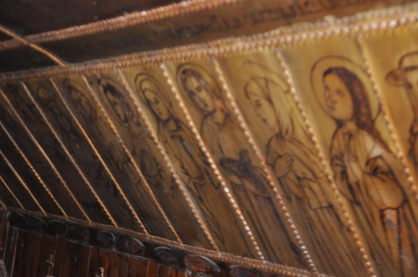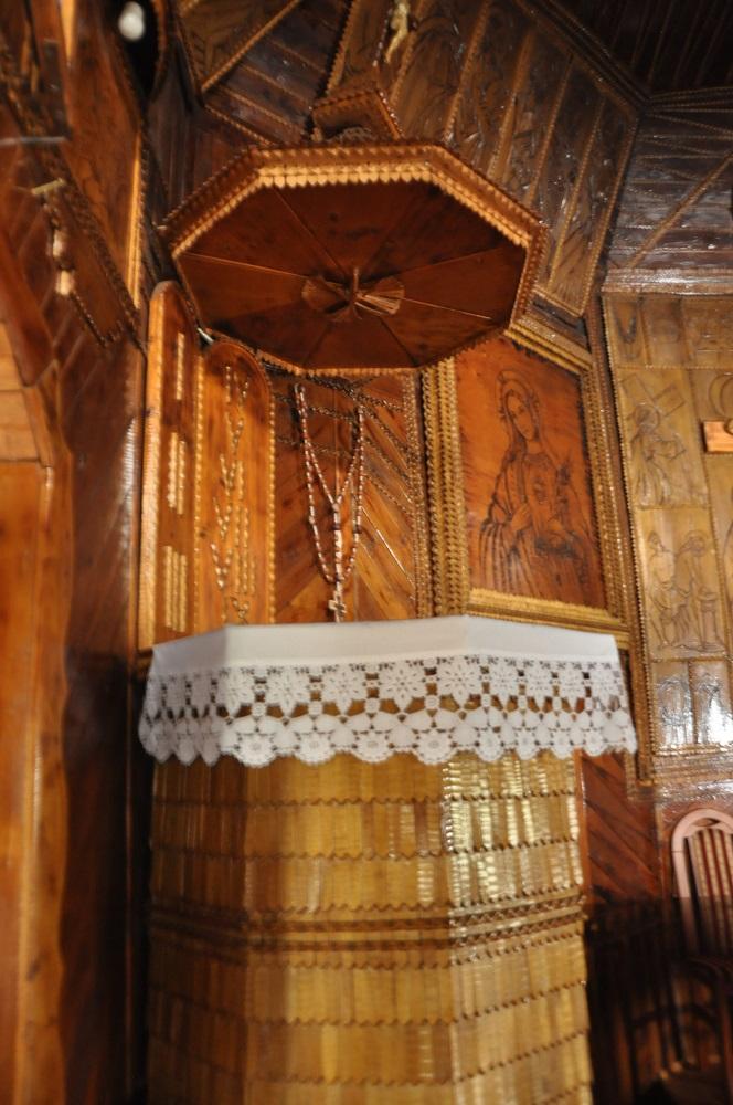 Charakterystyczna jest część, która jest głównym ołtarzem, gdzie widnieje wyrzeźbiony krzyż.