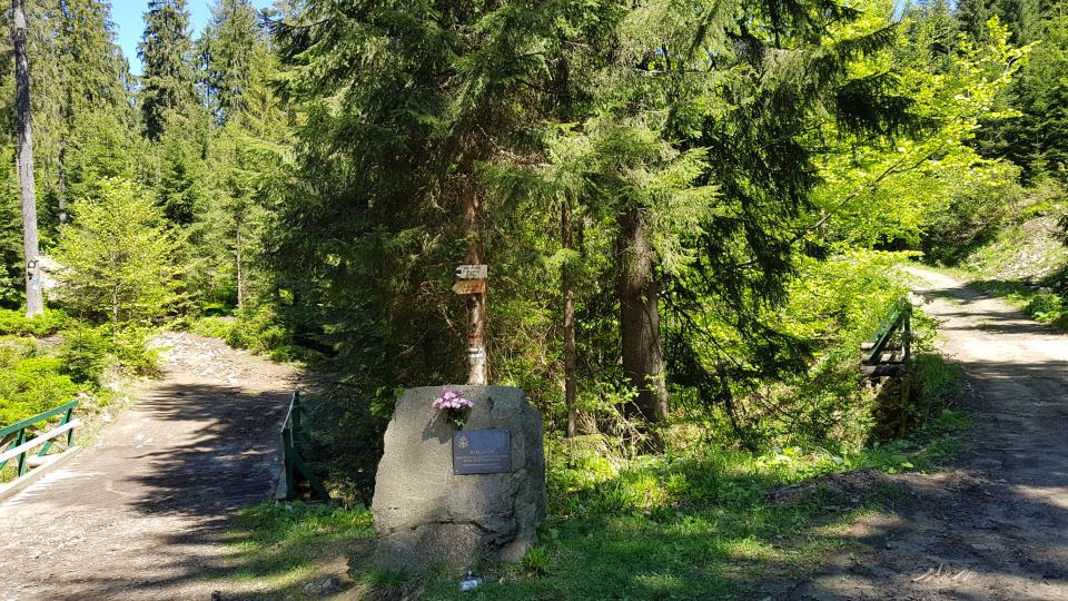 My ruszamy w górę czarnym szlakiem, drogą asfaltową wzdłuż potoku, po drodze miejsce biwakowe, by po kilkuset metrach przekroczyć drewnianym mostkiem jego koryto i ruszamy wyraźną bitą drogą dalej.